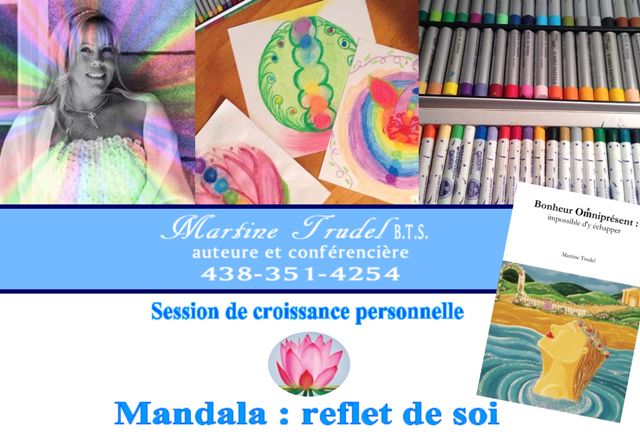 Atelier – Conférence Dimanche, le 23 octobre 2016   Date : 23 Octobre 2016 – DATES REMPLACÉES – Niveau 1 : 23 octobre ET Niveau 3 : le 15 octobre. Durée : 2 h 15 – de 14 h à  16 h 15 Lieu : Centre de santé et mieux-être Longueuil – Boutique lumière blanche :…… Lire la suite Mandala magique: activez votre pouvoir de création